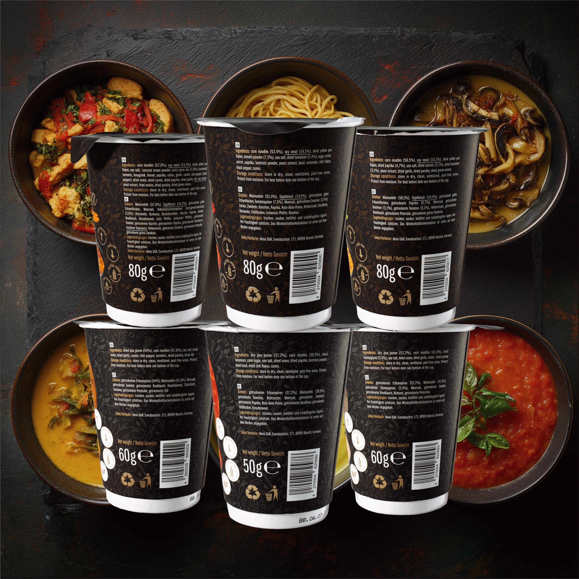 Die Grundlage all unserer Gerichte ist eine nährstoffreiche Komposition aus Hülsenfrüchten, Soja und schonend getrockneter Maispasta. Dadurch ist jede Mahlzeit reich an pflanzlichem Protein und 100% vegan. Sie spenden Kraft und sättigen angenehm, ohne ein Völlegefühl zu hinterlassen – deine verlässliche Mahlzeit für Büro, Homeoffice und unterwegs.