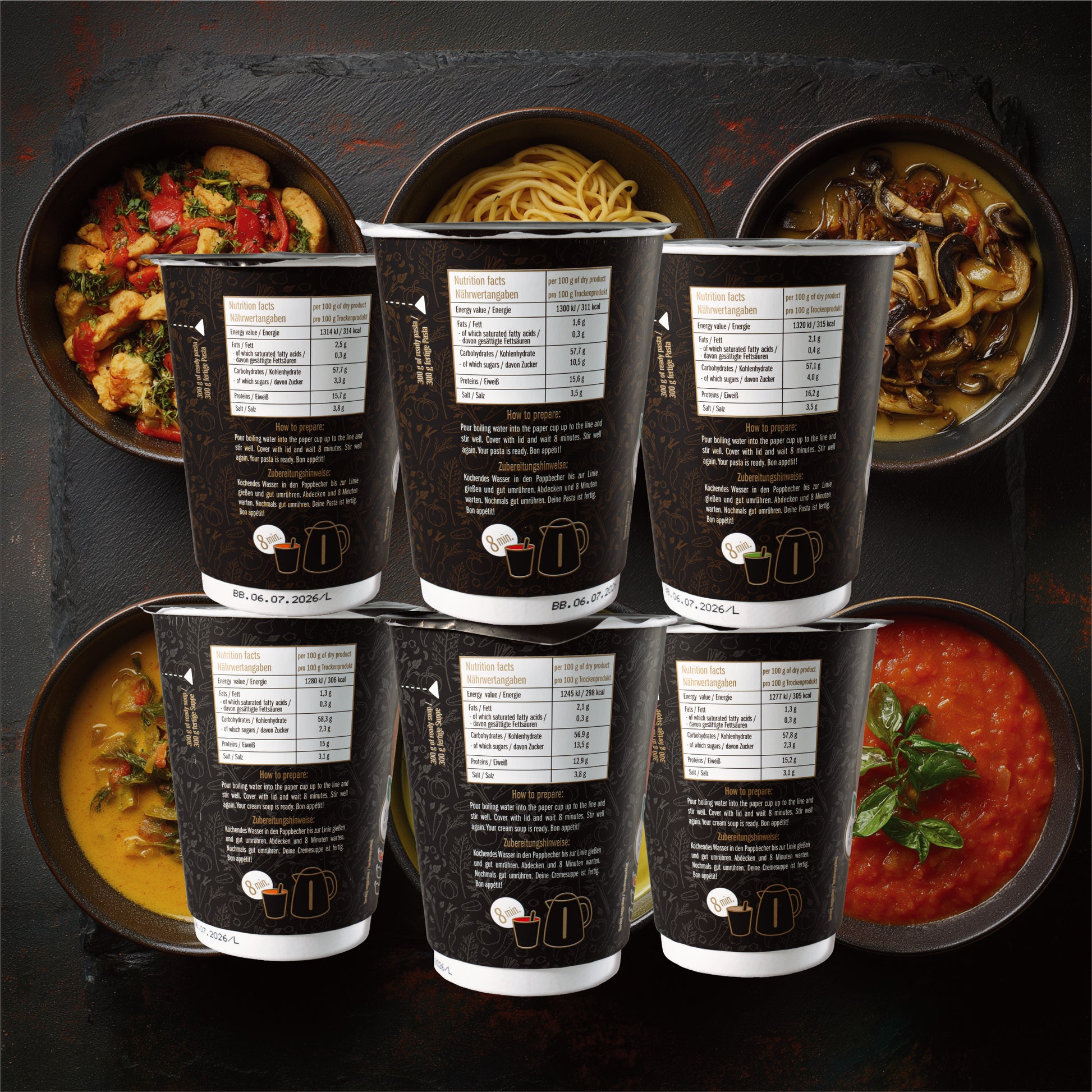 Deine warme Mahlzeit ist in 8 Minuten fertig: Deckel auf, kochendes Wasser rein, umrühren, kurz warten und genießen! Endlich gehören Kompromisse zwischen schnell und gesund der Vergangenheit an. Nutze die gewonnene Zeit für dich und erlebe den vollen Geschmack einer sorgfältig komponierten Mahlzeit.