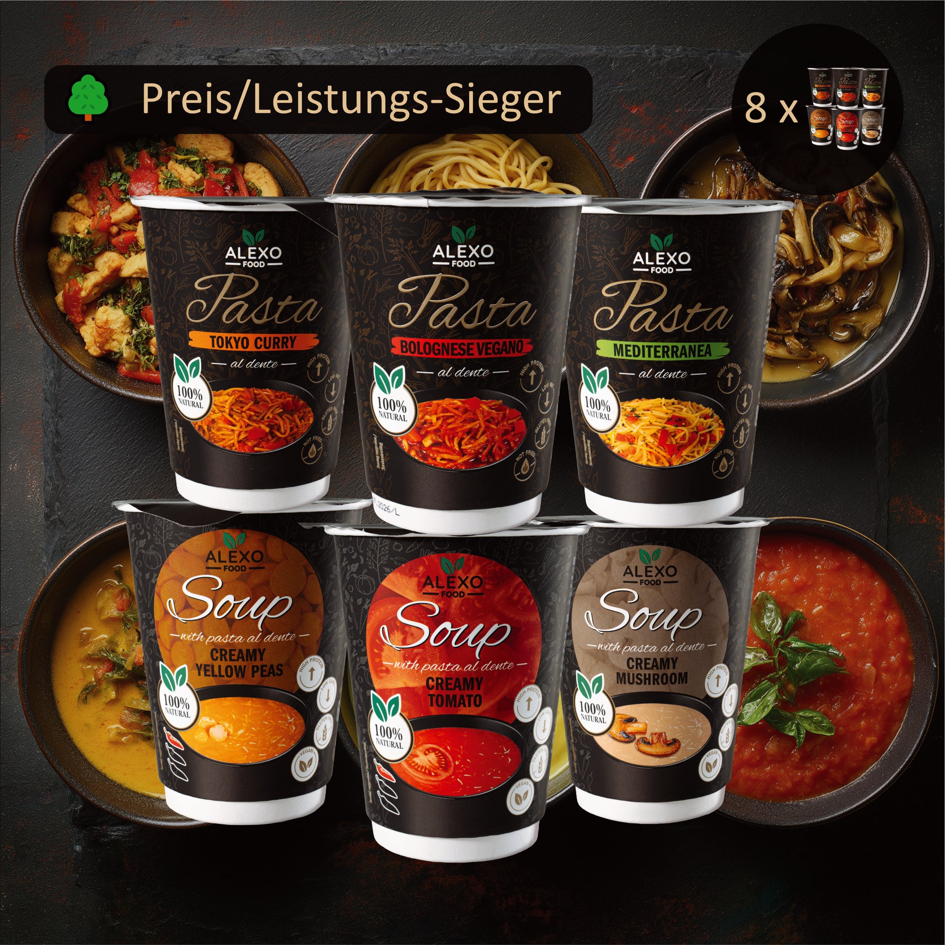 Die Box besteht aus 8 gemischten Paketen mit insgesamt 48 Bechern (2 Mahlzeiten × 24 Tage): 3 x Pasta (Bolognese Vegano, Mediterranea, Tokyo Curry) und 3 x Suppe mit Nudeln (Tomate, Gelbe Erbse, Pilz), jeweils 8 Becher. Damit hast du für 24 Tage die volle Abwechslung.
