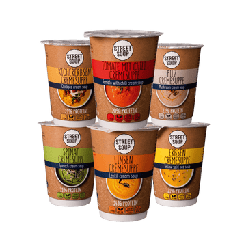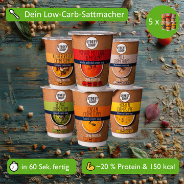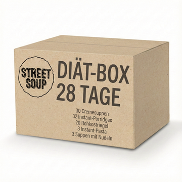 Auf der Suche nach einer Diät, die dich wirklich satt macht, ohne dass du stundenlang kochen musst? Die Street Soup Wohlfühlkur ist dein XXL Abnehmpaket für eine bewusste Ernährungsumstellung. Mit unserem Bundle aus 82 hochwertigen, abwechslungsreichen und natürlichen Mahlzeiten hast du immer eine schnelle Mahlzeit griffbereit. Enthalten sind gesunde Fertiggerichte wie natürliche Instant-Cremesuppen, Instant-Nudeln, Instant-Porridges und Rohkostriegel. Diese Diätbox ist ein Plan, der dir Struktur im stressigen Alltag gibt, dich mit Proteinen versorgt und den Heißhunger stoppt.