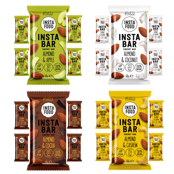 Insta Bar Almond & Cocoa: Dried dates (dates, rice flour), almonds (19.1%), cocoa mass (9.0%), carob, sea salt.