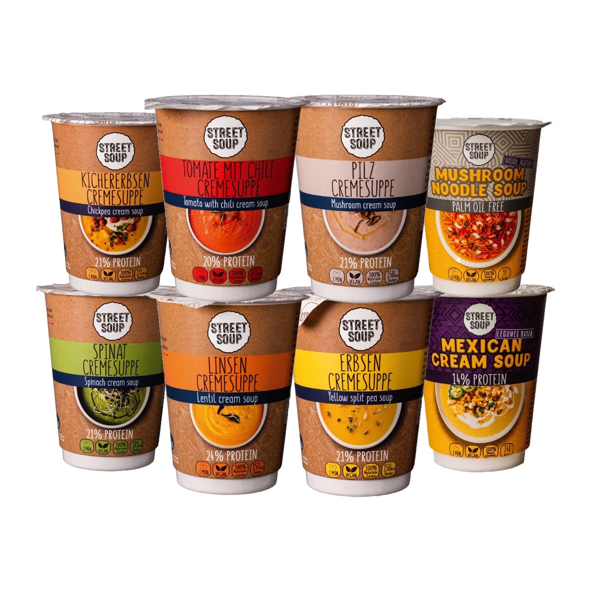 This Try contains All 8 delicious flavors by Street Soup: Linse cream, pea cream, chickpea cream, tomato cream, spinach cream, mushroom cream, Mexican cream soup and noodle soup with mushrooms. Each single cup with 300 grams of soup each. The best thing about it: all ingredients are 100% natural and vegan. With partially more than 20% protein Is it a healthy and balanced meal that Only 150 calories per portion Contains.