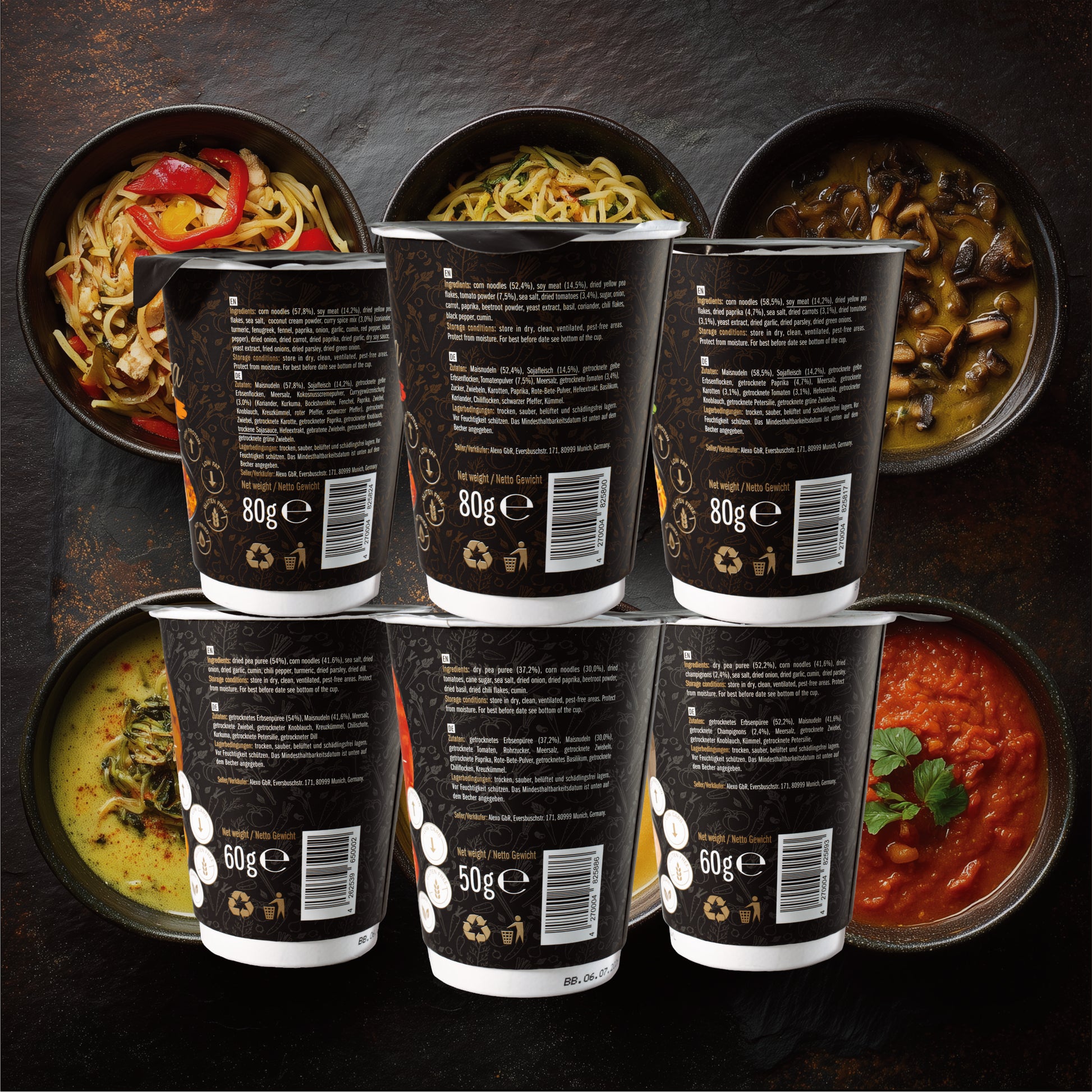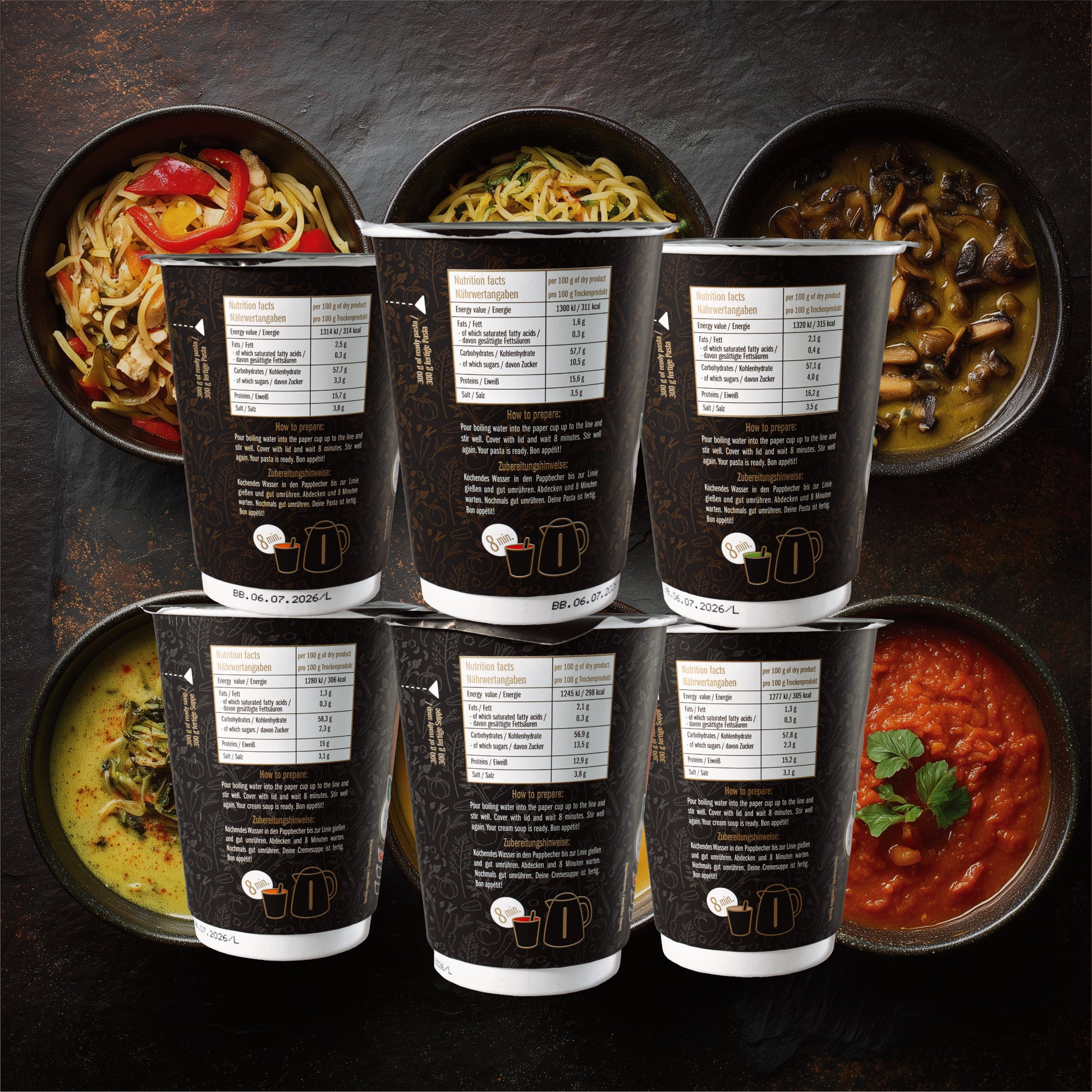 Die Box besteht aus 4 gemischten Paketen mit insgesamt 24 Bechern (2 Mahlzeiten × 12 Tage): 3 x Pasta (Bolognese Vegano, Mediterranea, Tokyo Curry) und 3 x Suppe mit Nudeln (Tomate, Gelbe Erbse, Pilz), jeweils 4 Becher. Damit hast du für 12 Tage die volle Abwechslung.