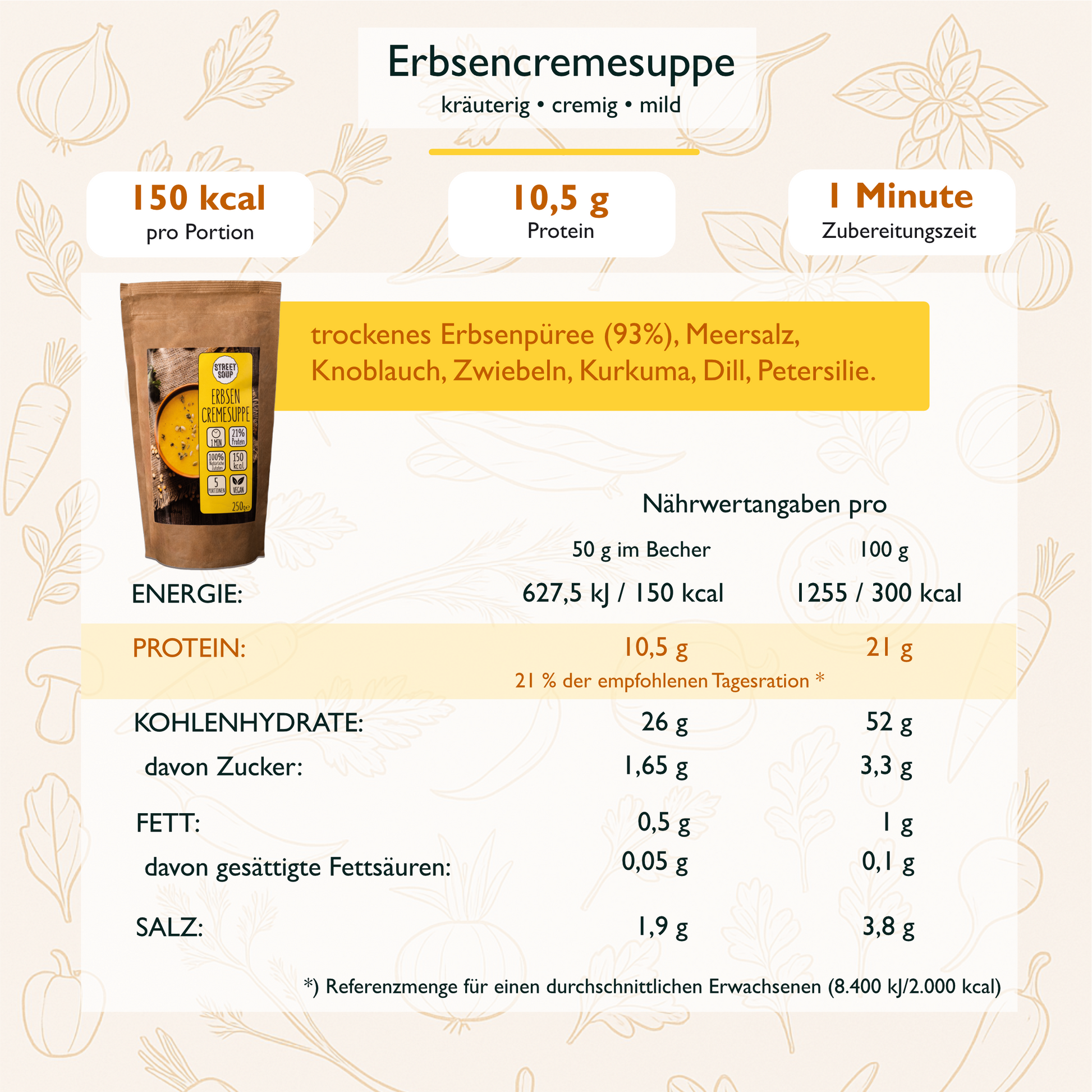 Erbsencremesuppe: Trockenes Erbsenpüree (93 %), Meersalz, Knoblauch, Zwiebeln, Kurkuma, Dill, Petersilie. Kann Spuren von Gluten und Weizen enthalten.