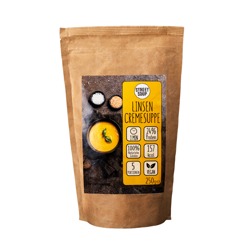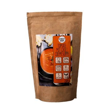 Das Street Soup Vorratspaket versorgt dich über volle 5 Tage mit abwechslungsreichen Cremesuppen. In fünf wiederverschließbaren Beuteln stecken insgesamt 25 Portionen.