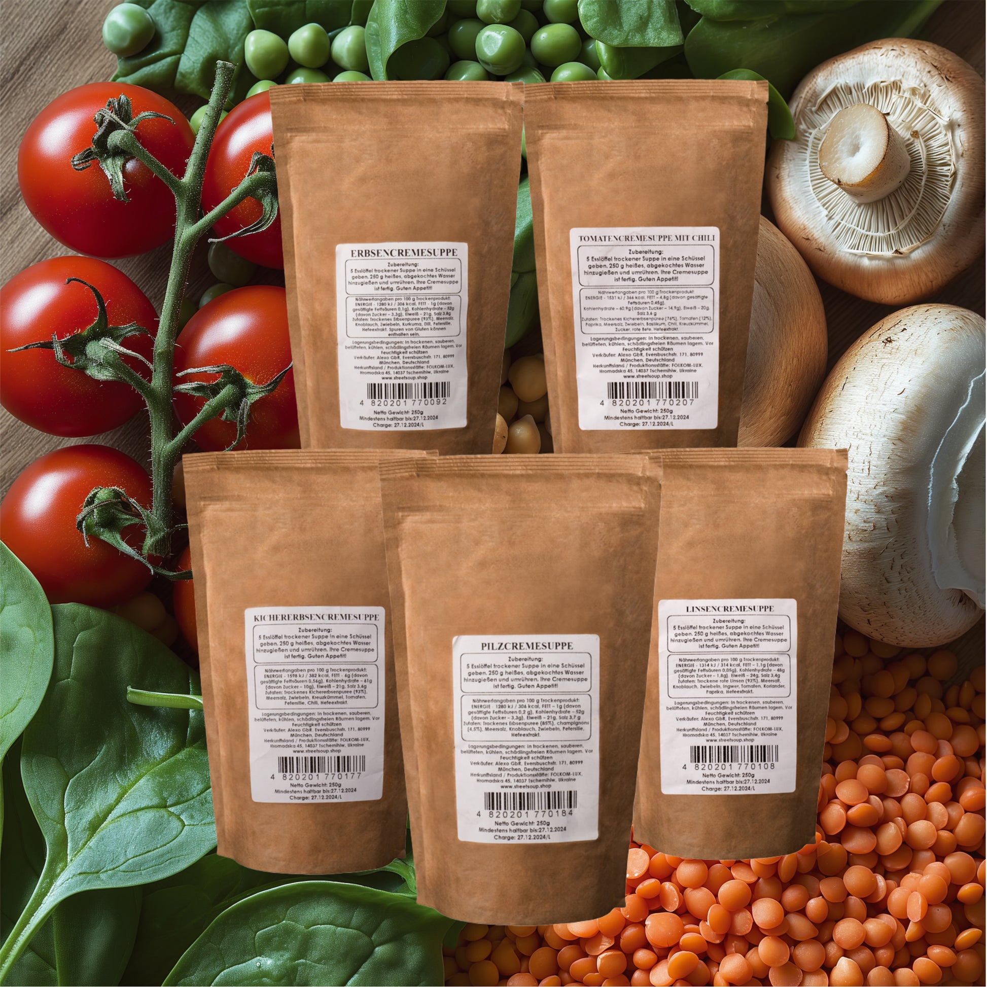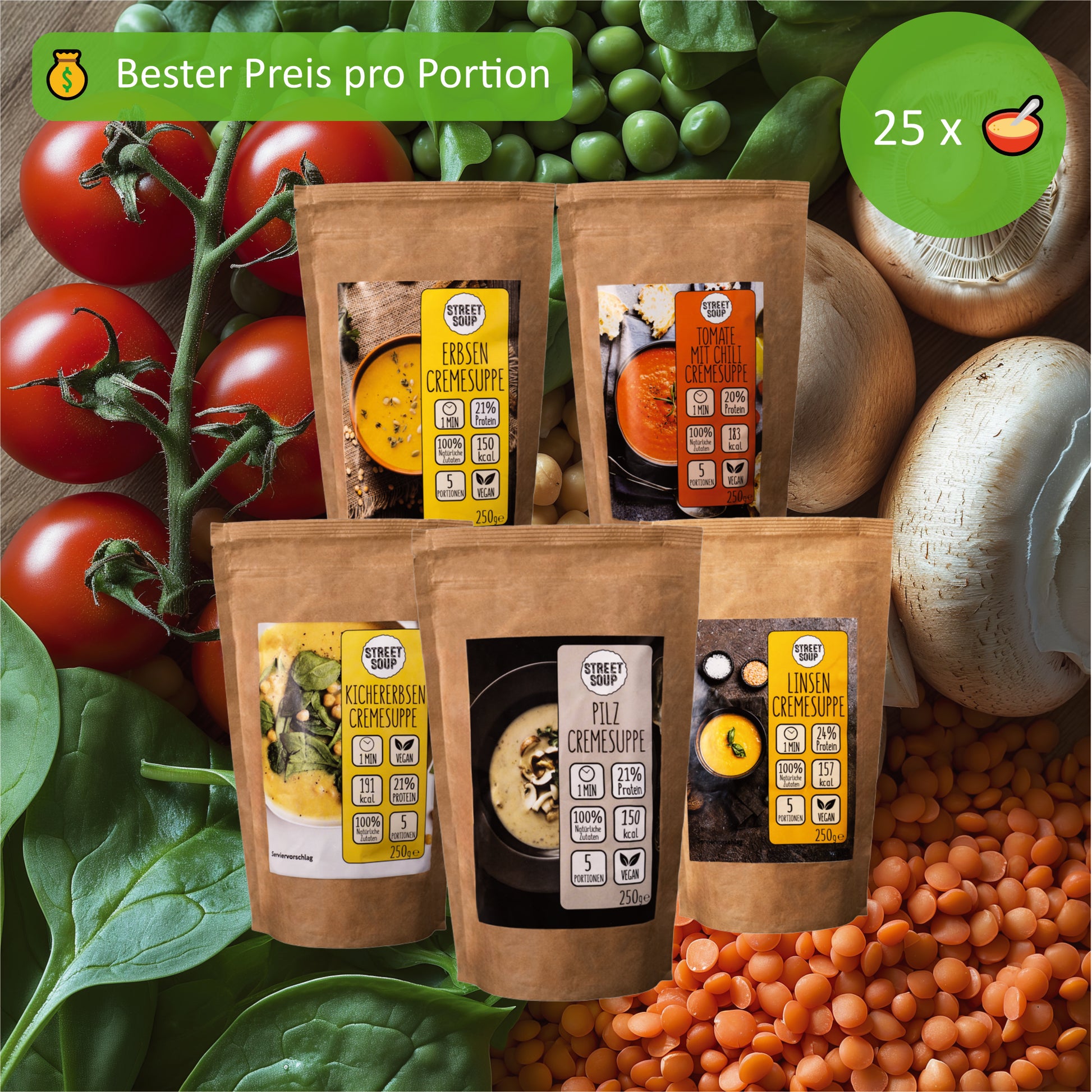 Du erhältst fünf wiederverschließbare Beutel mit insgesamt 25 Portionen Cremesuppe. Enthalten sind fünf Geschmacksrichtungen: Linse, Erbse, Kichererbse, Tomate und Pilz. Pro Beutel sind 250 g Trockenprodukt für je 5 Portionen enthalten.
